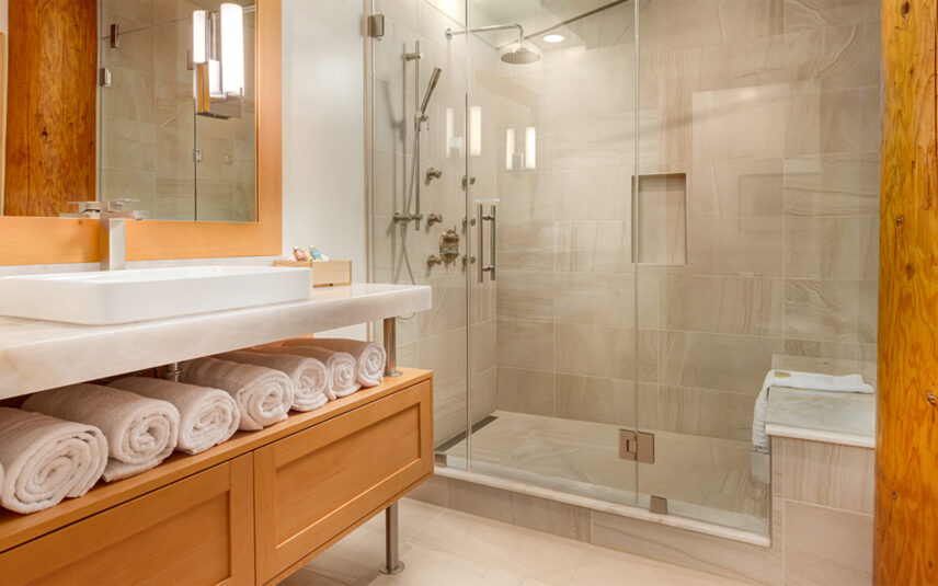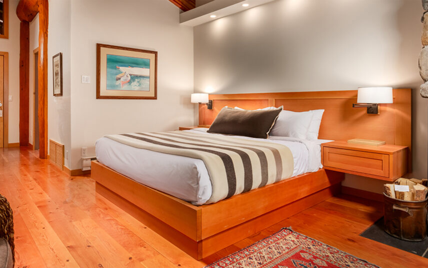 Located on the upper floor of the Main Lodge, the luxurious Deluxe Lodge Room is a pure escape, with nothing to distract you from deep tranquility. Our premier room features one king-size bed and a luxurious bathroom reflecting true Canadian Lodge heritage with beautiful hand-hewn Douglas fir post-and-beam construction, a river rock wood-burning fireplace and a private balcony overlooking the lake and the Tower of Babel.