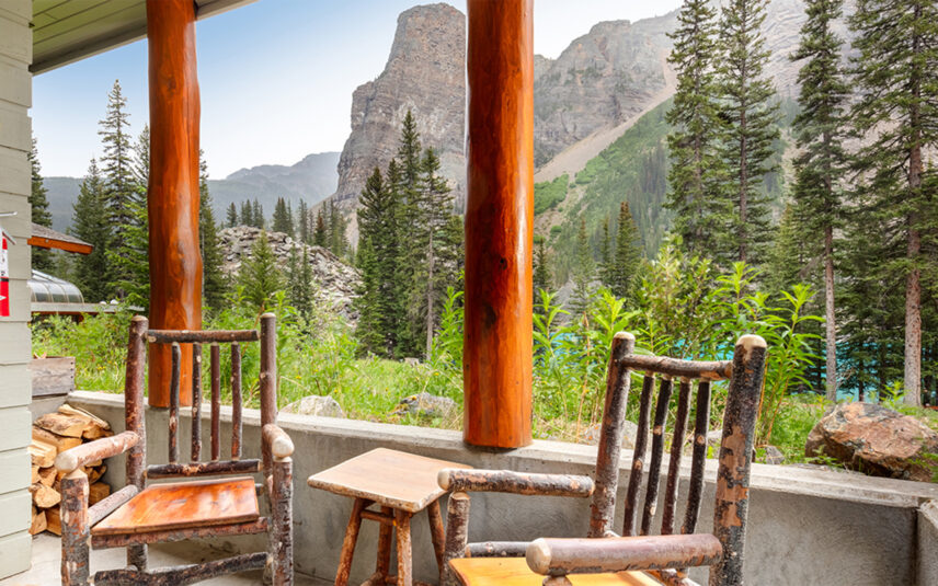 Our Lower Wenkchemna Queen Room offers a welcoming and comfortable retreat with a queen-size bed and a cozy river rock wood-burning fireplace. Accessible by a flight of exterior steps, this ground-level gem invites you to relax and enjoy serene Moraine Lake and mountain views through its expansive picture windows.
